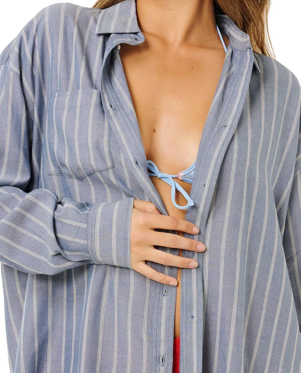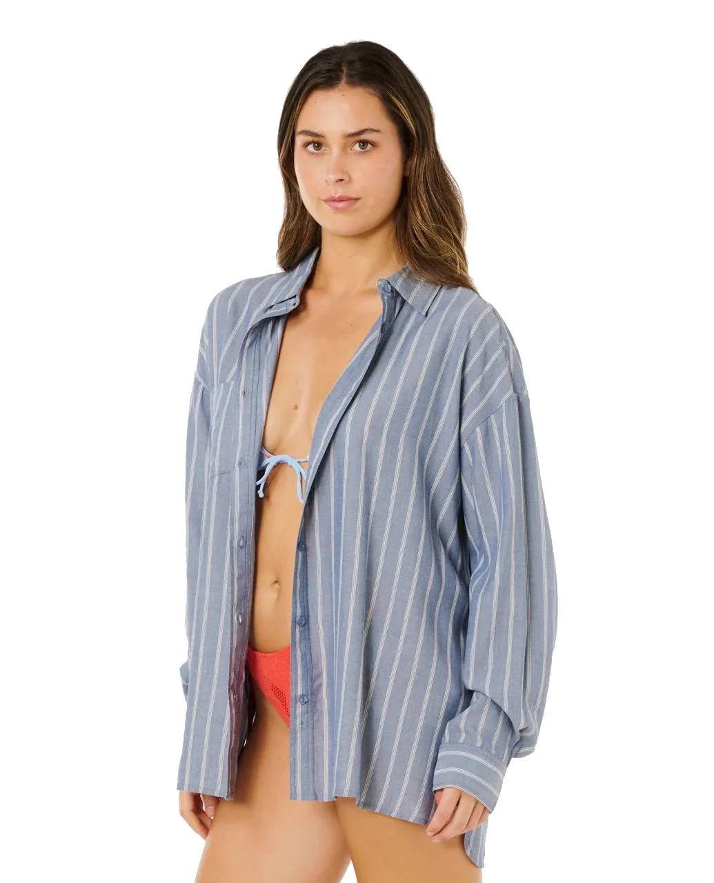 Prugasti uzorak bojan u predivu i opušteni kroj definiraju Beach Days Pinstripe košulju, dovršenu prednjim džepom i metalnim logotipom za uredan obalni izgled.